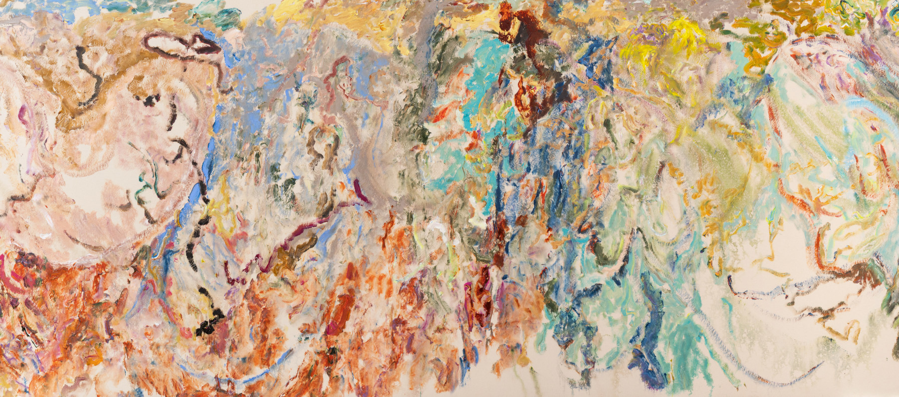 Eventually Poons came to feel that the purely optical approach to making art was restricting, and in the late 1970s he began to work by pouring and throwing paint on the canvas—again in an attempt to compose a painting without leaving traces of the artist’s hand. It was also during this period that he began attaching miscellaneous materials to the canvas—foam balls, for example, or rope. In the 1990s, Poons returned to using a paintbrush, working on rolls of canvas unfurled across the four walls of his studio, so that he could immerse himself in the work as he made it. At the end of this process, he would painstakingly crop out individual paintings from the massive length of each roll.